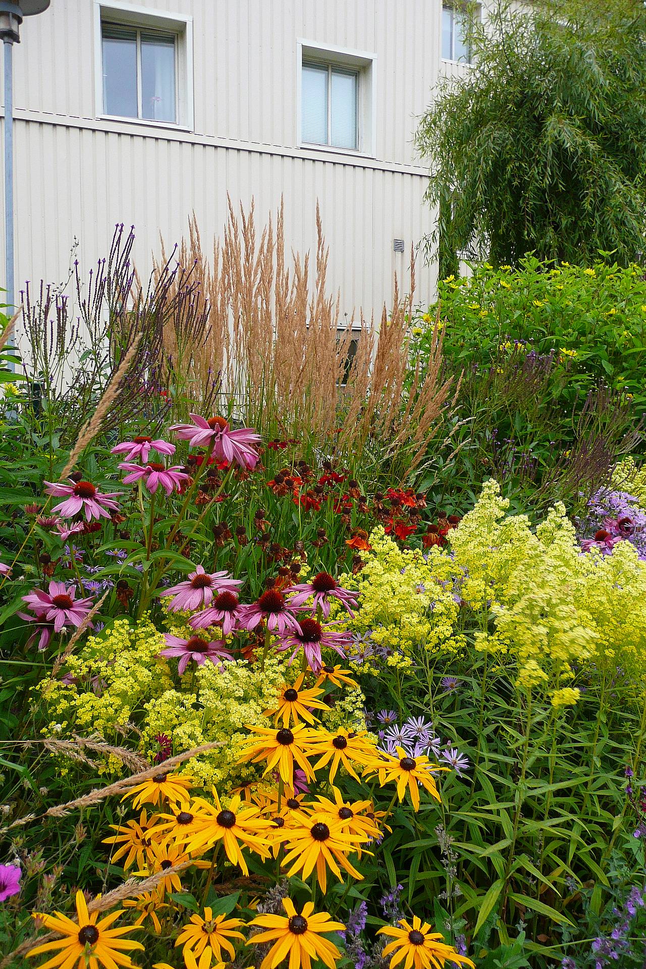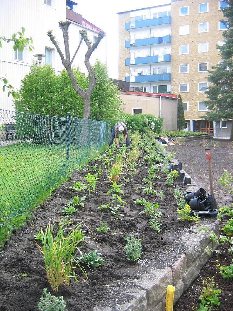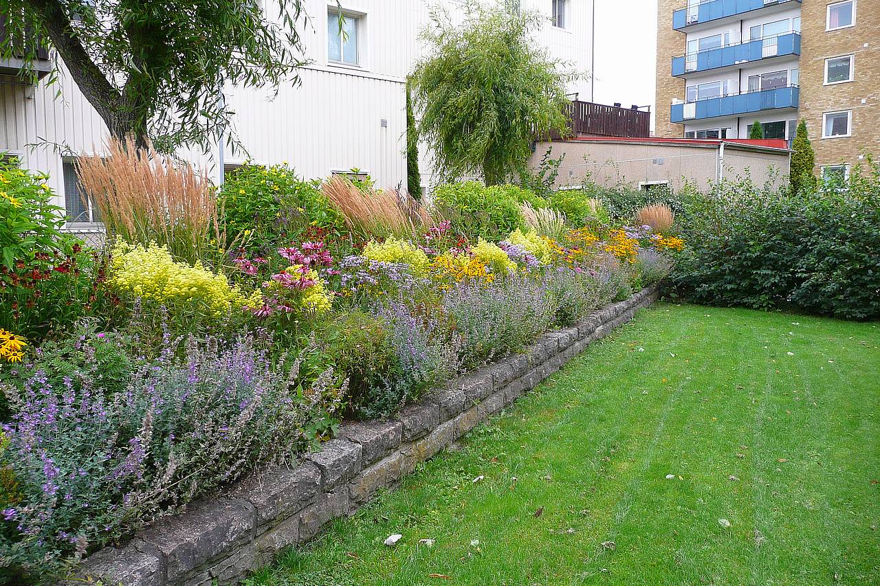 Centralt beläget bostadsområde som har varit negligerat under många år. Bilden visar en perennplantering på en befintlig kalkstensmur som tidigare bestod av en gräsmatta och är nu förvandlad till en präktig blomsterrabatt.
