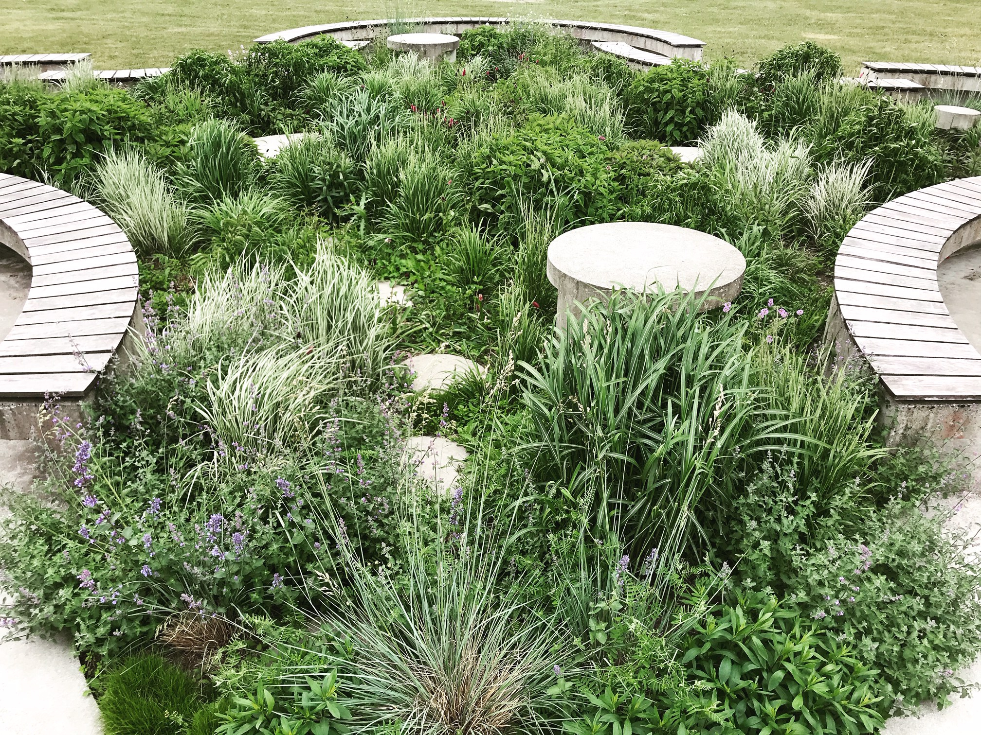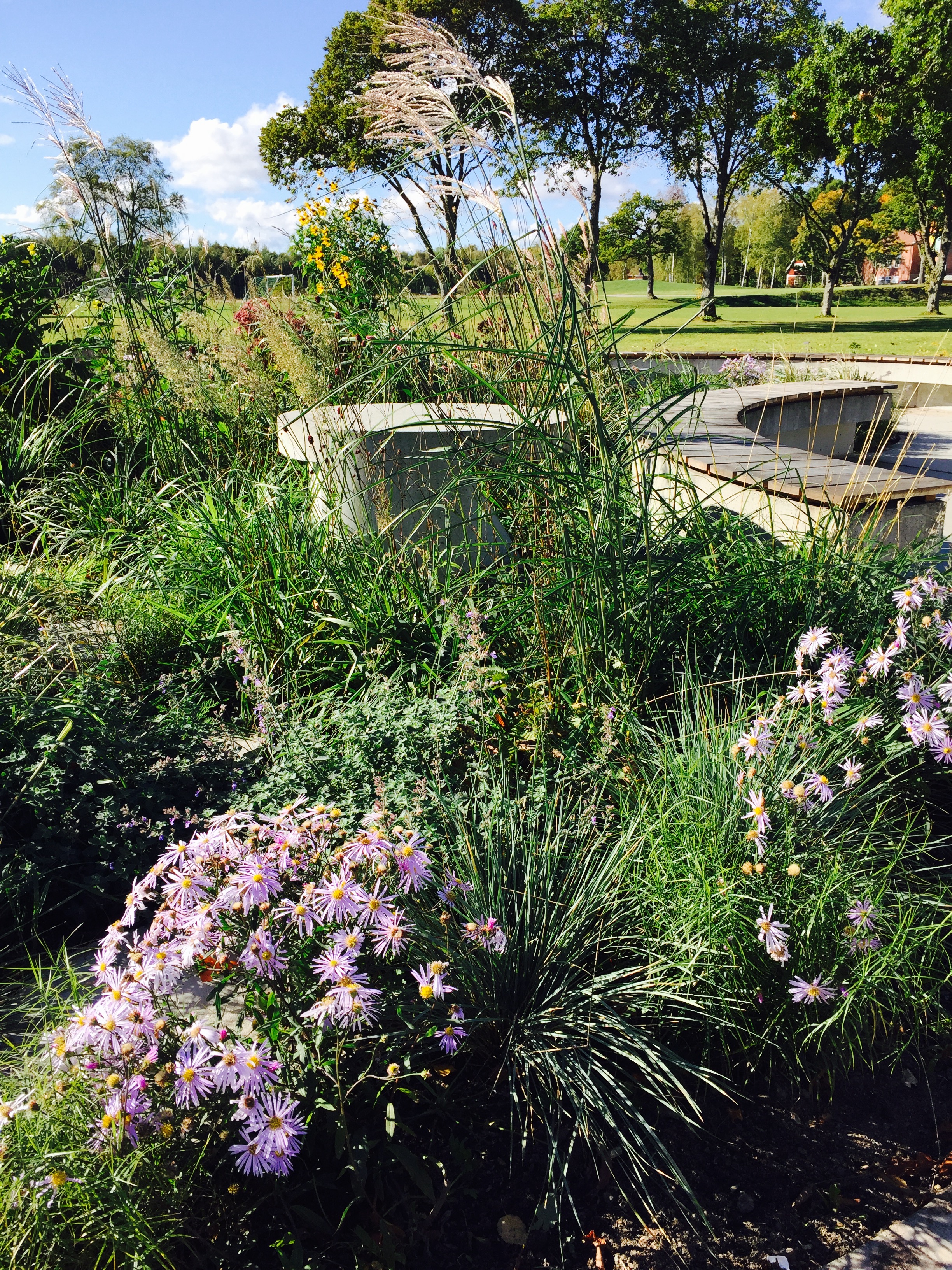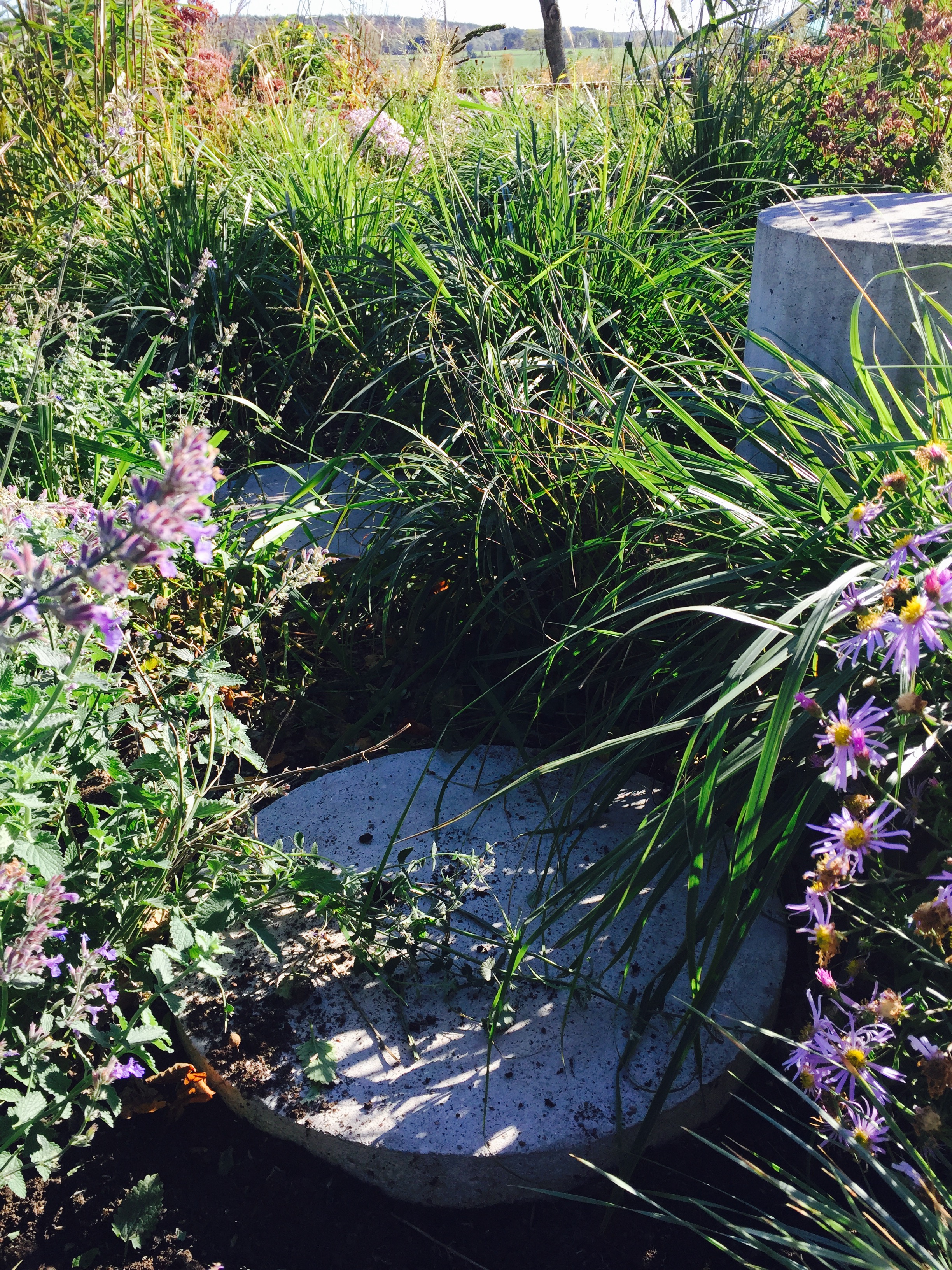 Perennplantering i fyra olika betongelement. Olika färg tema och växt tema.