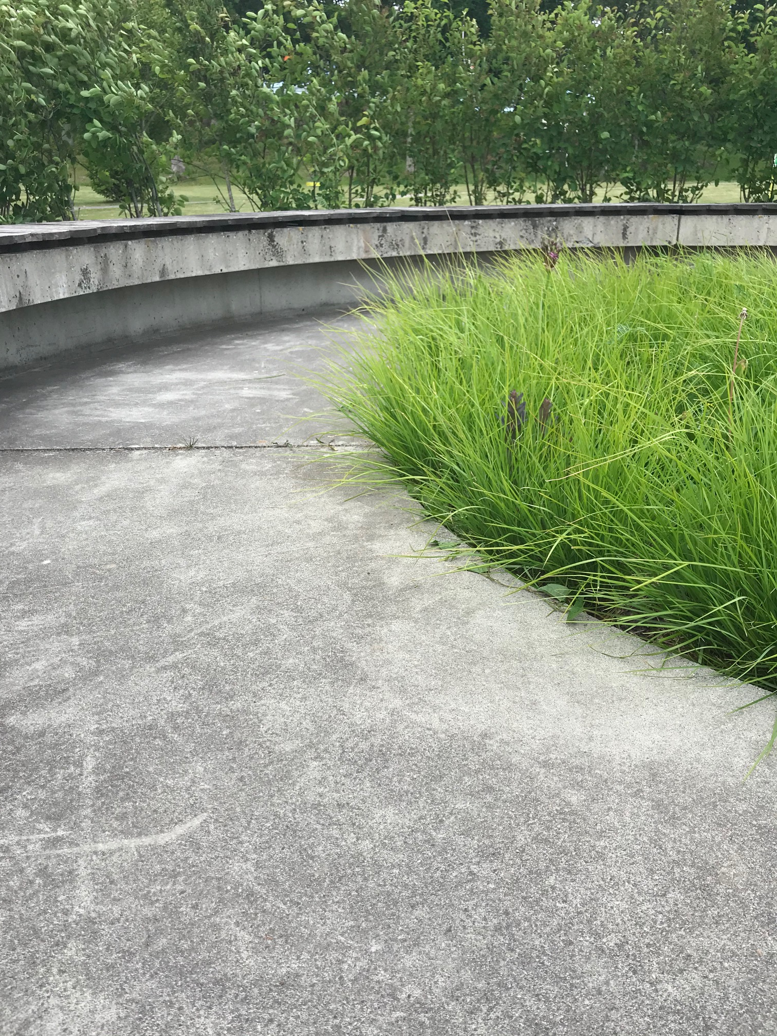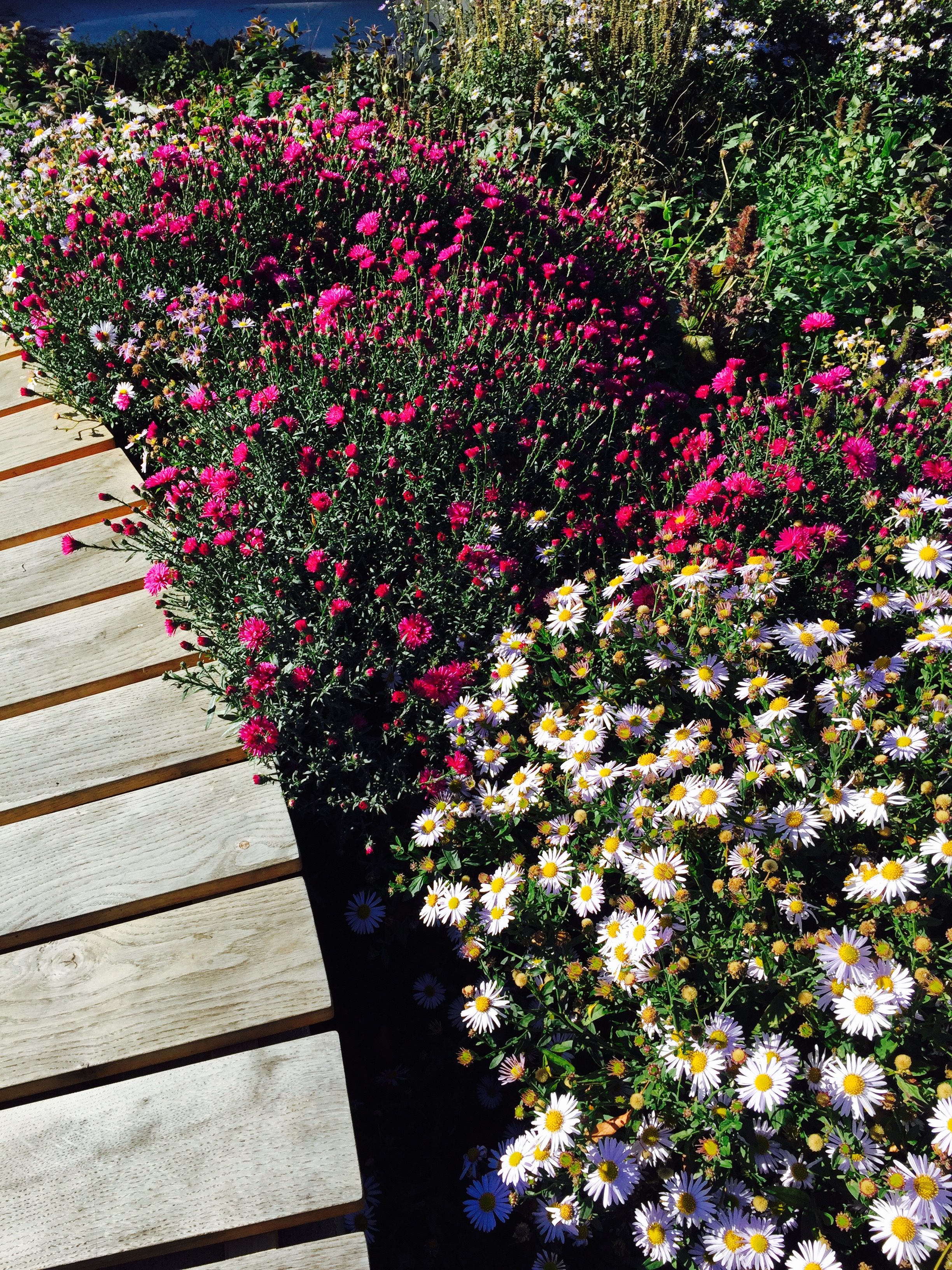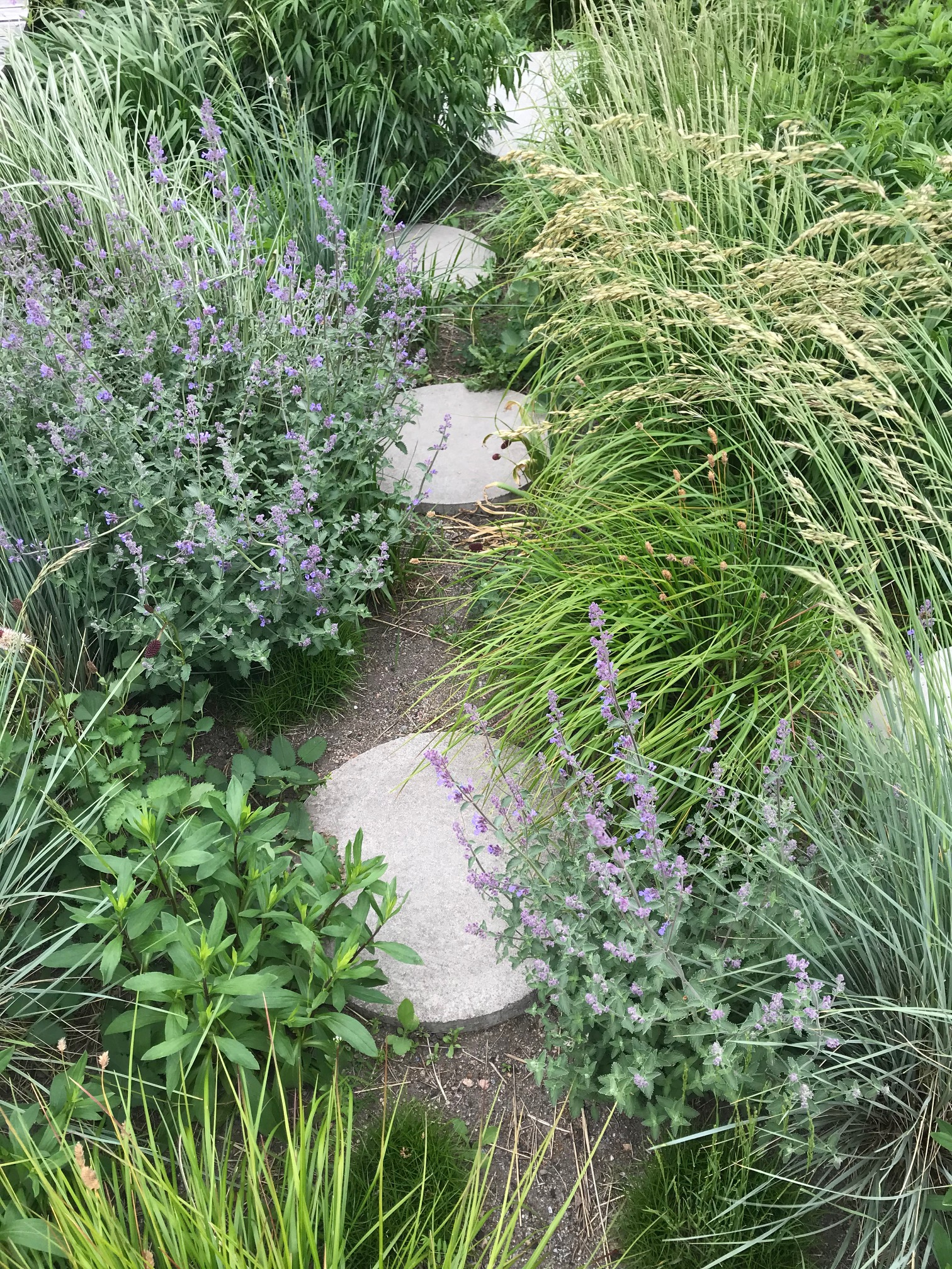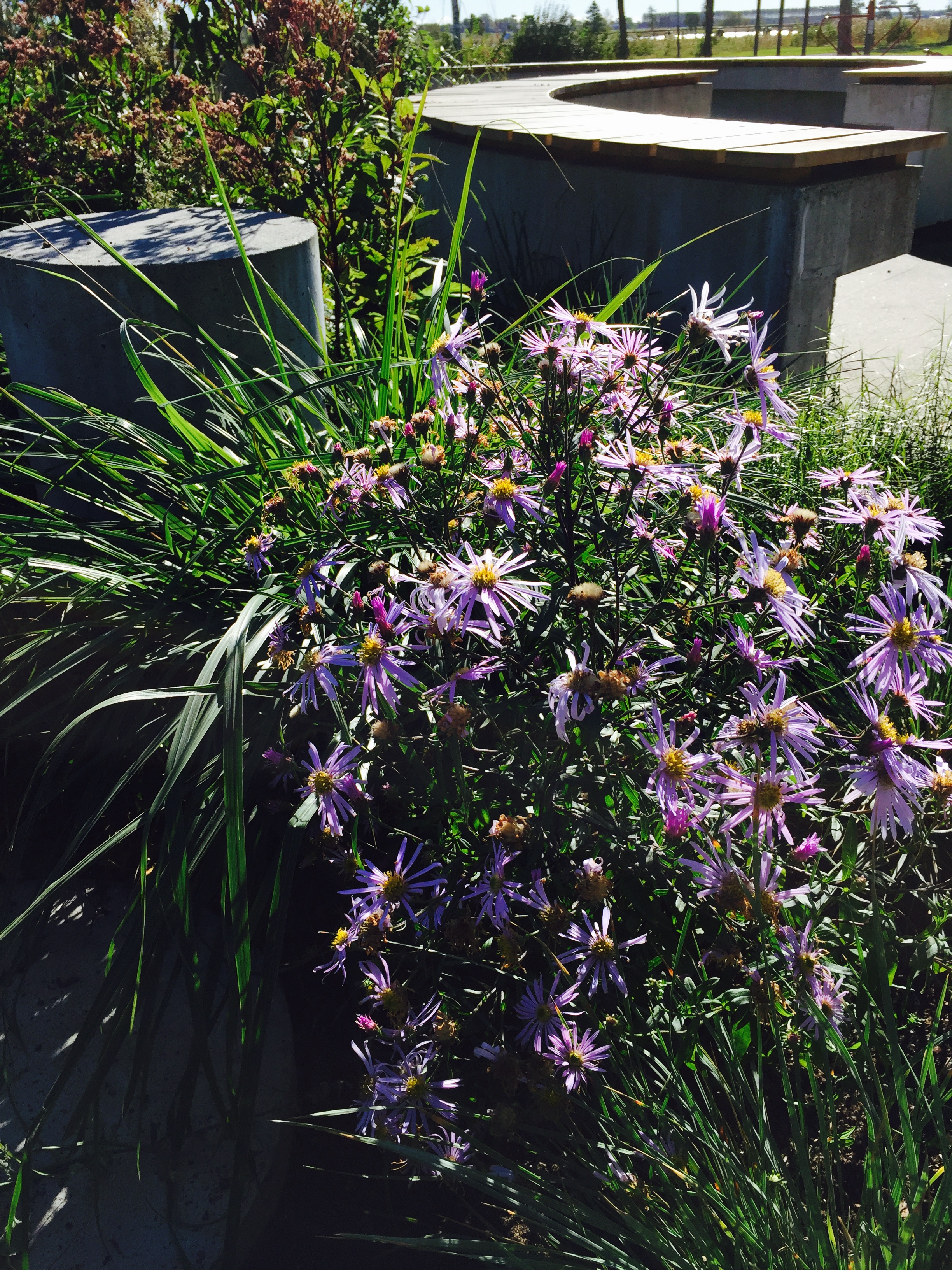 Perennplantering i fyra olika betongelement. Olika färg tema och växt tema.
