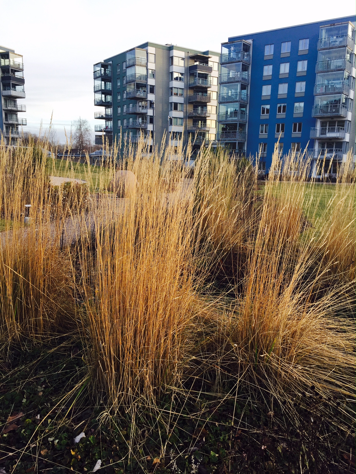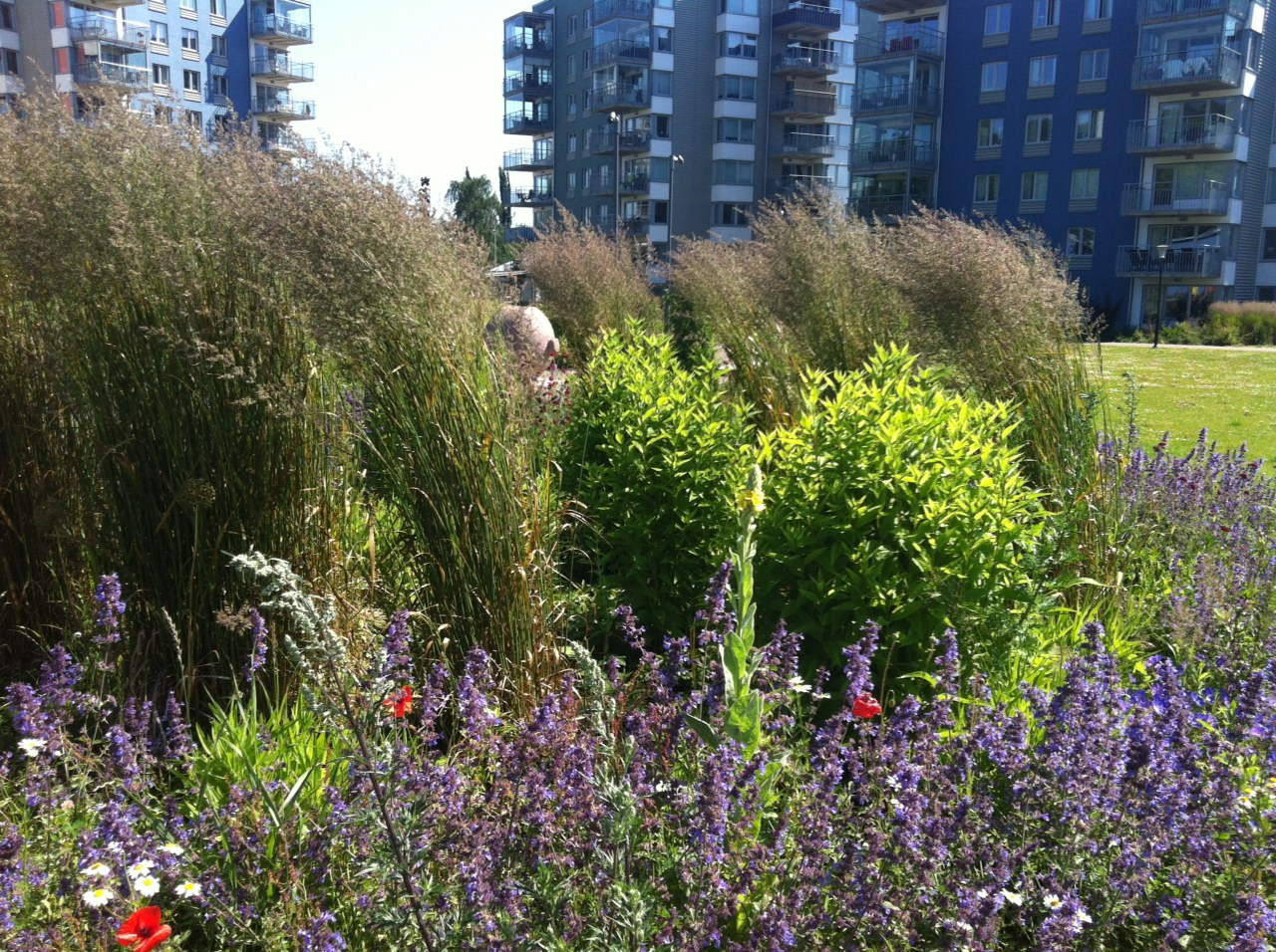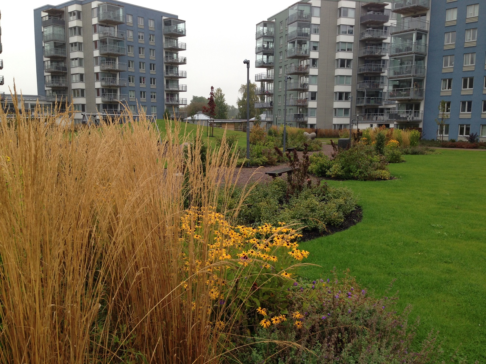 Växtmaterial är valt för att skapa en genomarbetad och omväxlande parkmiljö - där former och färger kompletterar varandra och växlar över årstiderna.