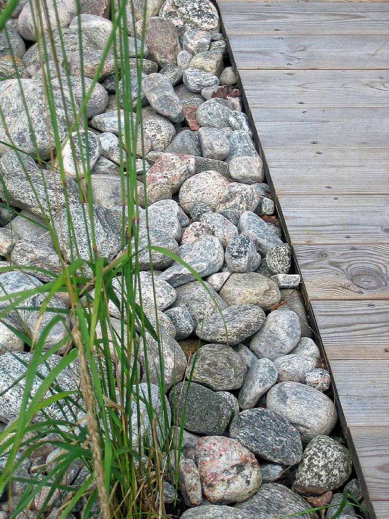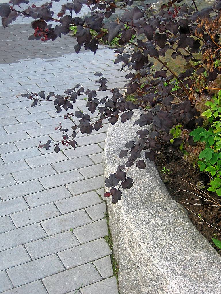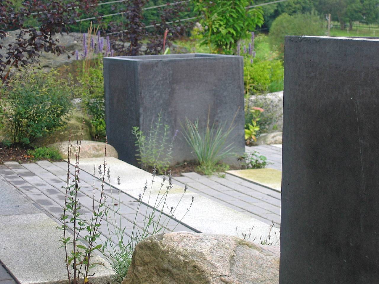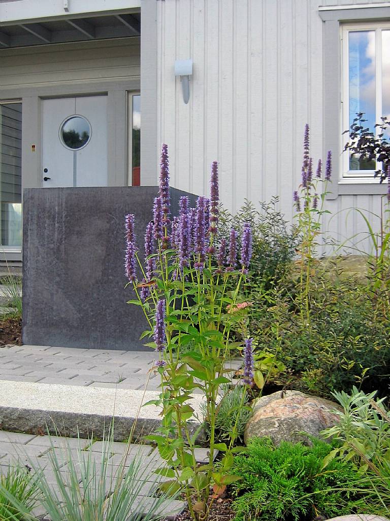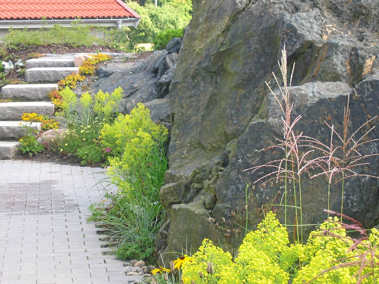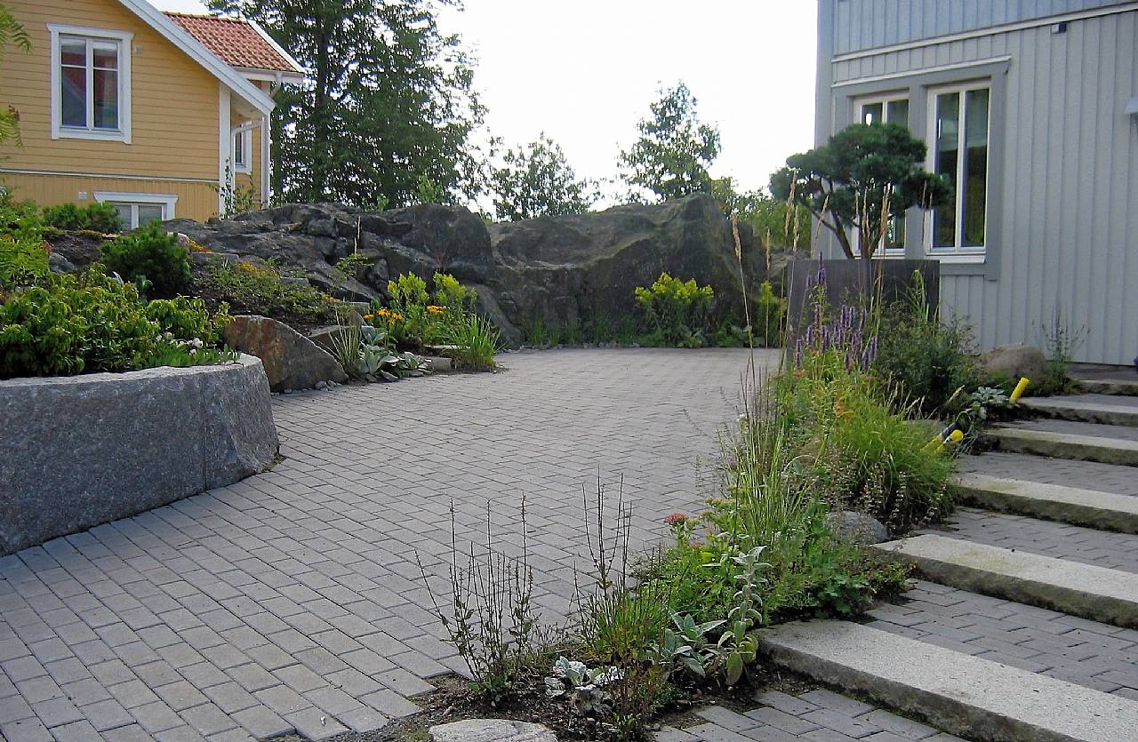 Ett nybyggt hus som står på ett bergsområde. Hårdmaterial består av funktionell betongmarksten kombinerat med svensk granit och sibirisk lärk. Plantering som inkluderar prydnadsgräs måste tåla väl dränerad och torr planteringsmiljön.