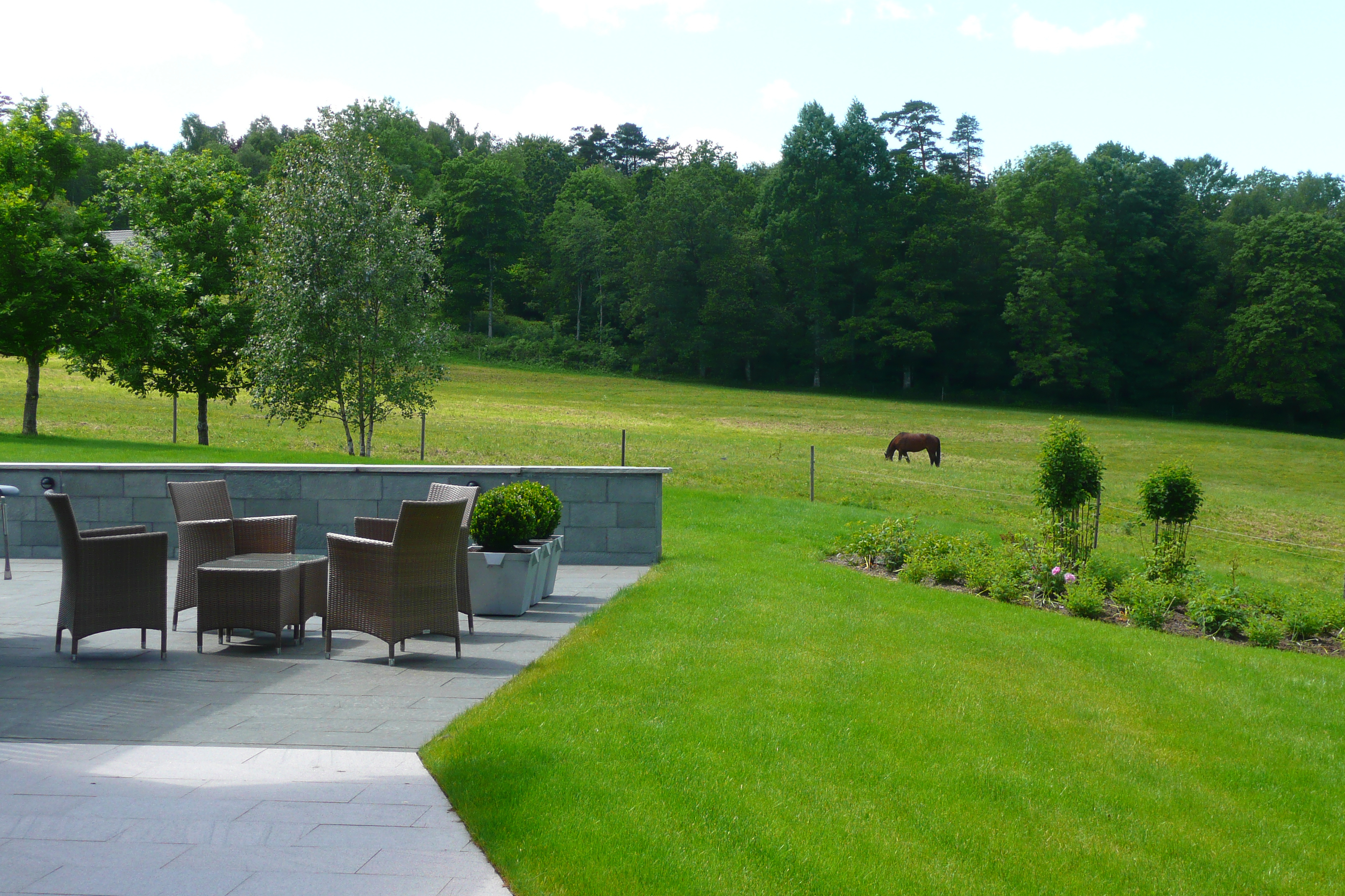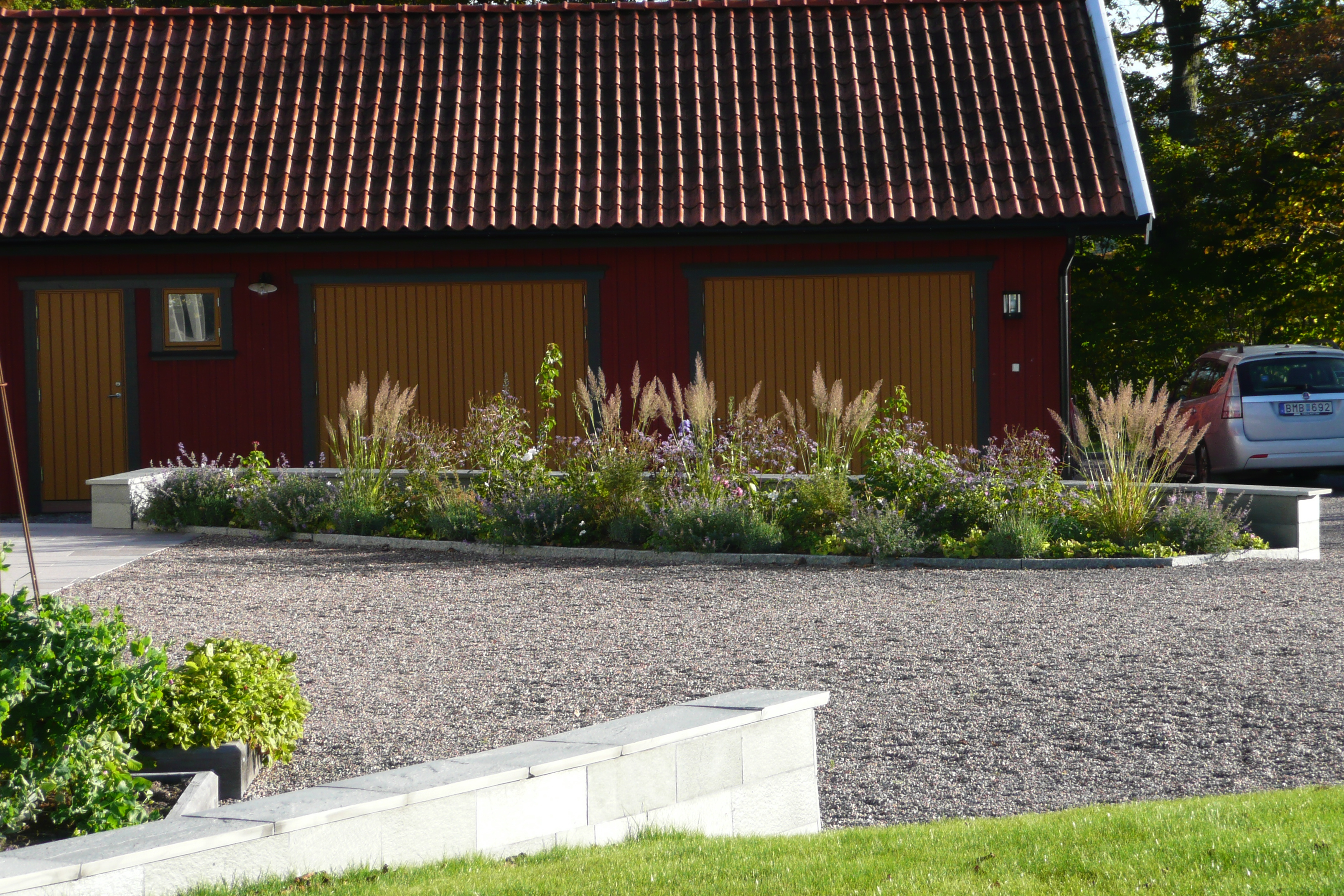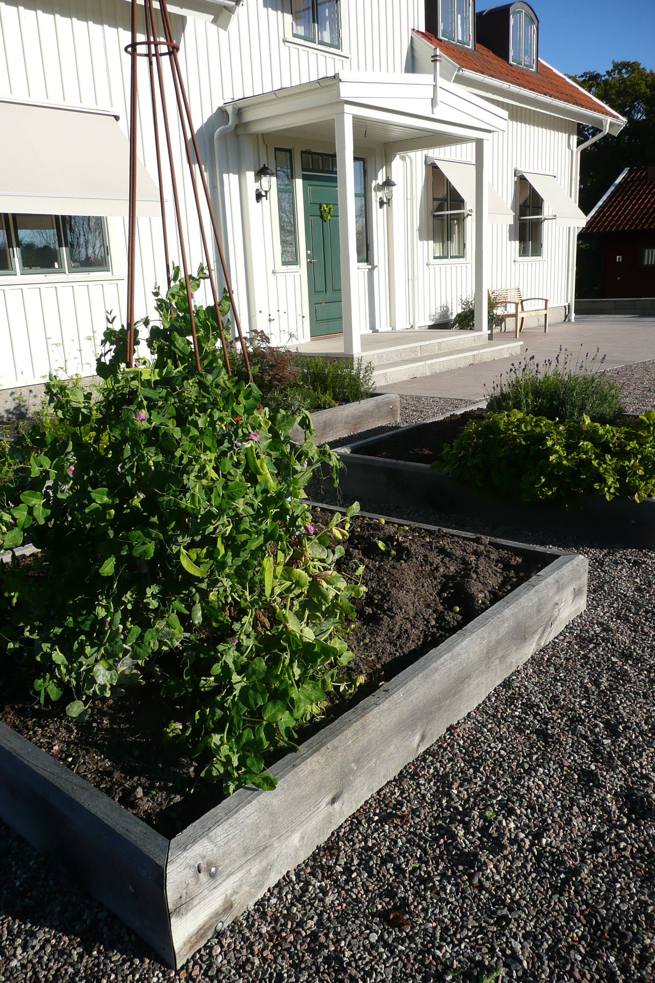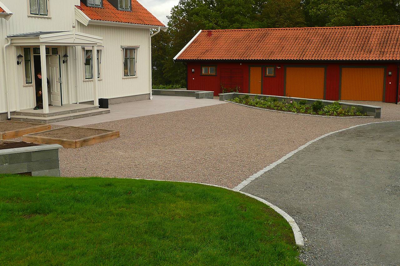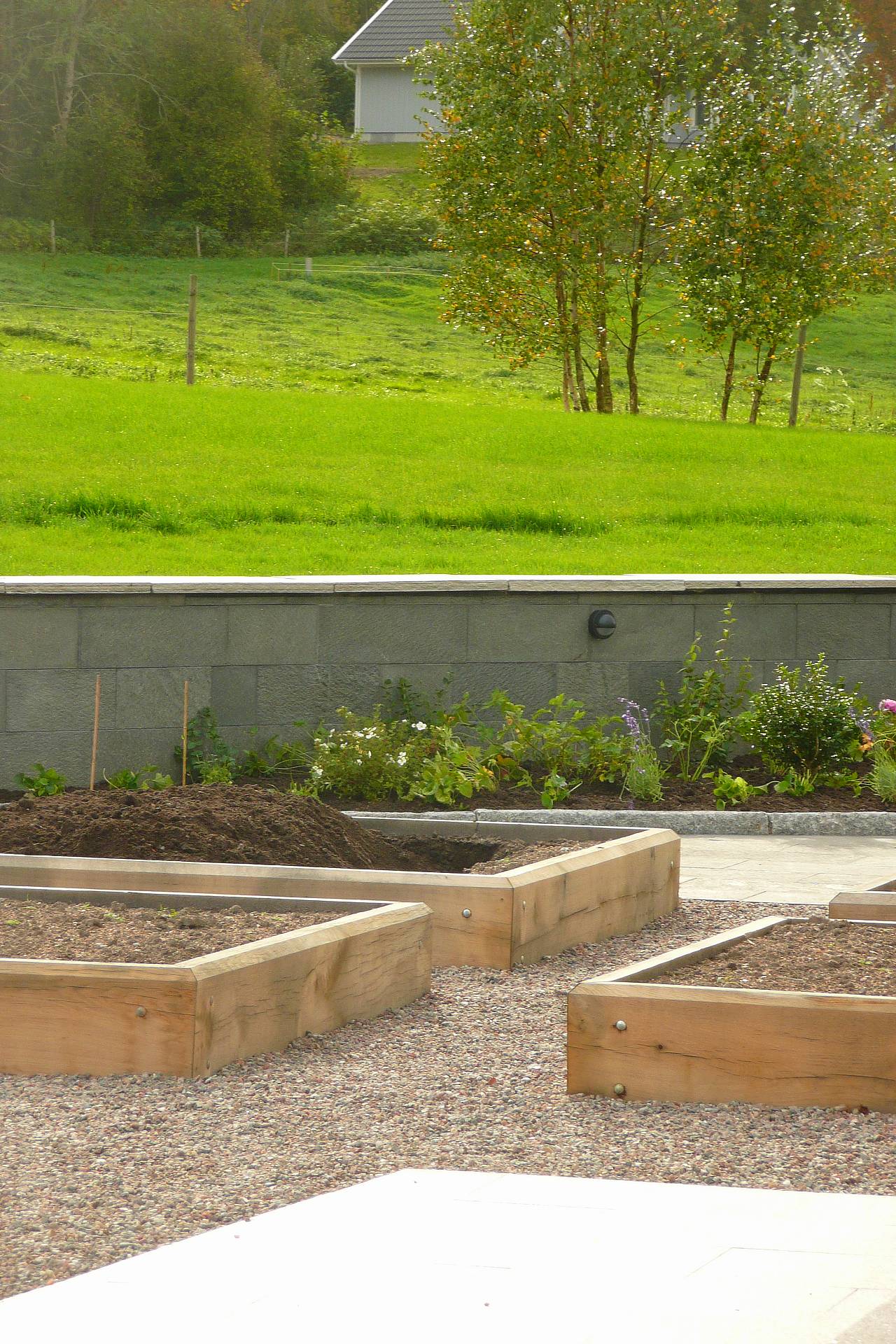 Ett nybyggt hus på landet i stort behov av att få en bättre kontakt med framtida trädgård och omgivningar. Naturstensklädda murar ramar in huset och ger planteringsmöjligheter. Huset står på naturstenplattor och definierar olika användningzoner. En formell upphöjd köksträdgård framför huset utnyttjar det bästa odlingsklimatet och kommer att bli ett vackert inslag vid husets entré.
