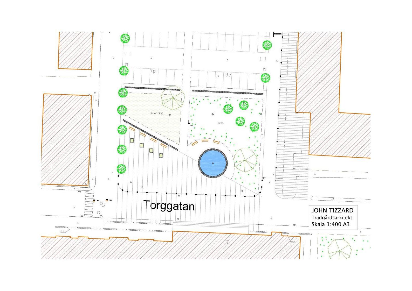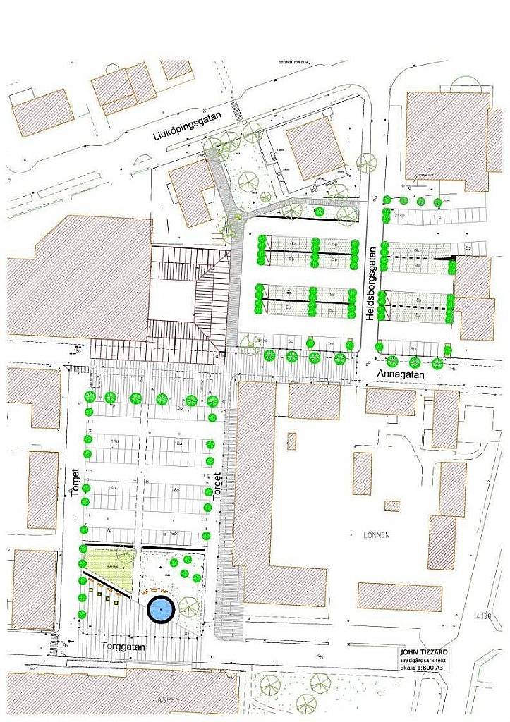 Förslag till centrumförnyelse som inkluderar en ny stadspark med vattenspel och mötesplats samt nya parkeringslösningar.