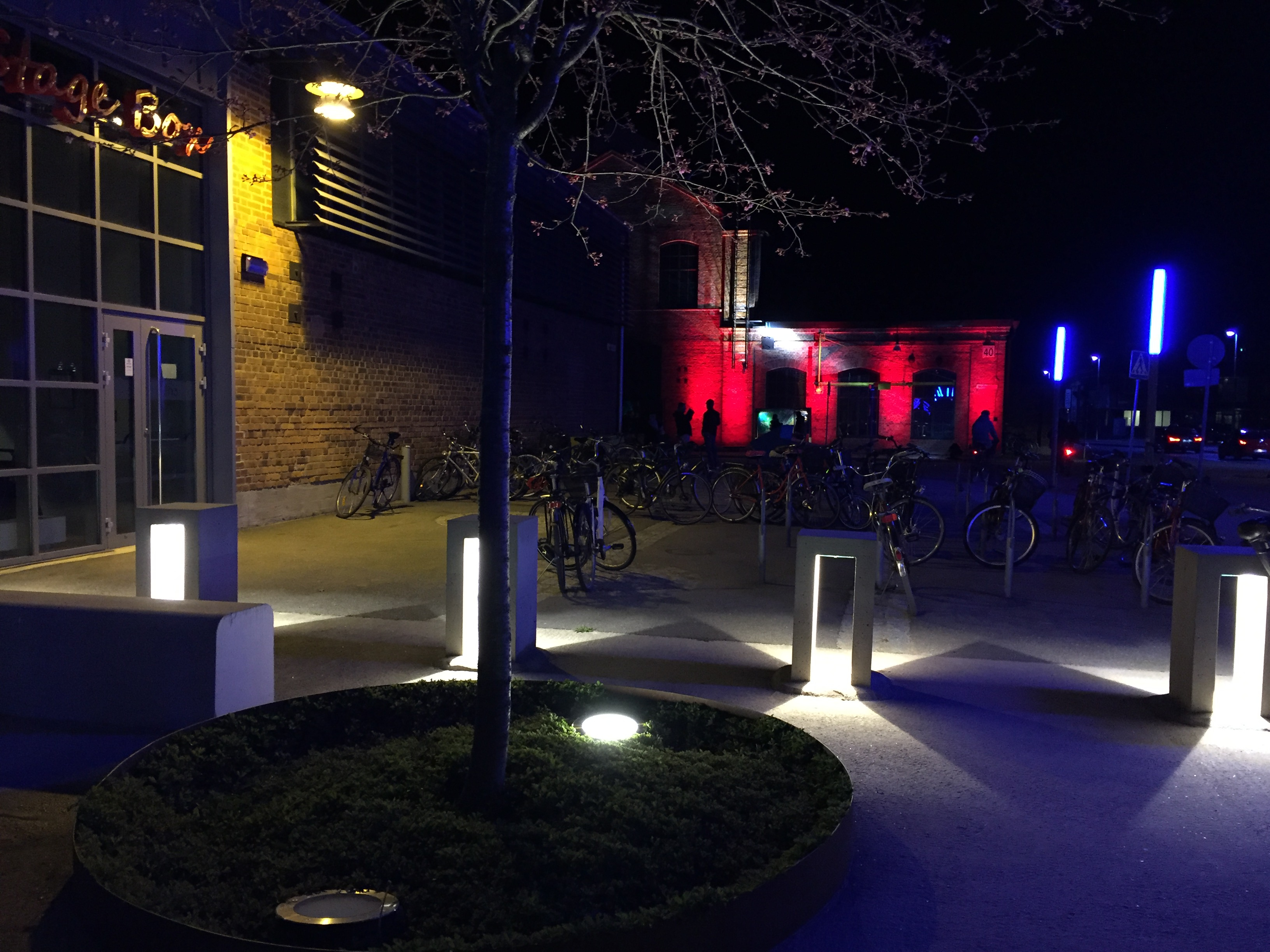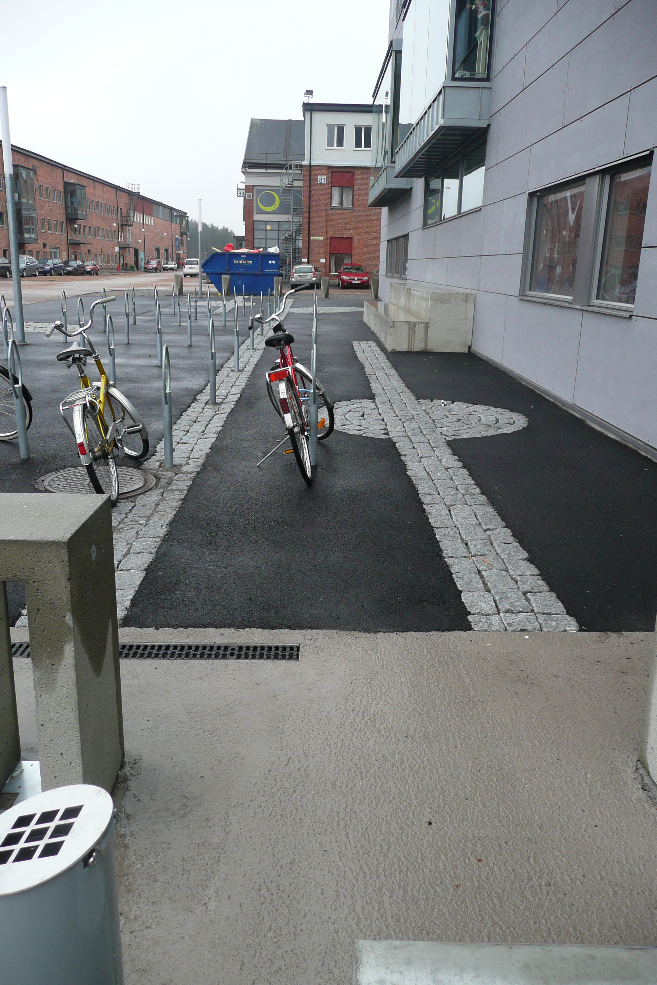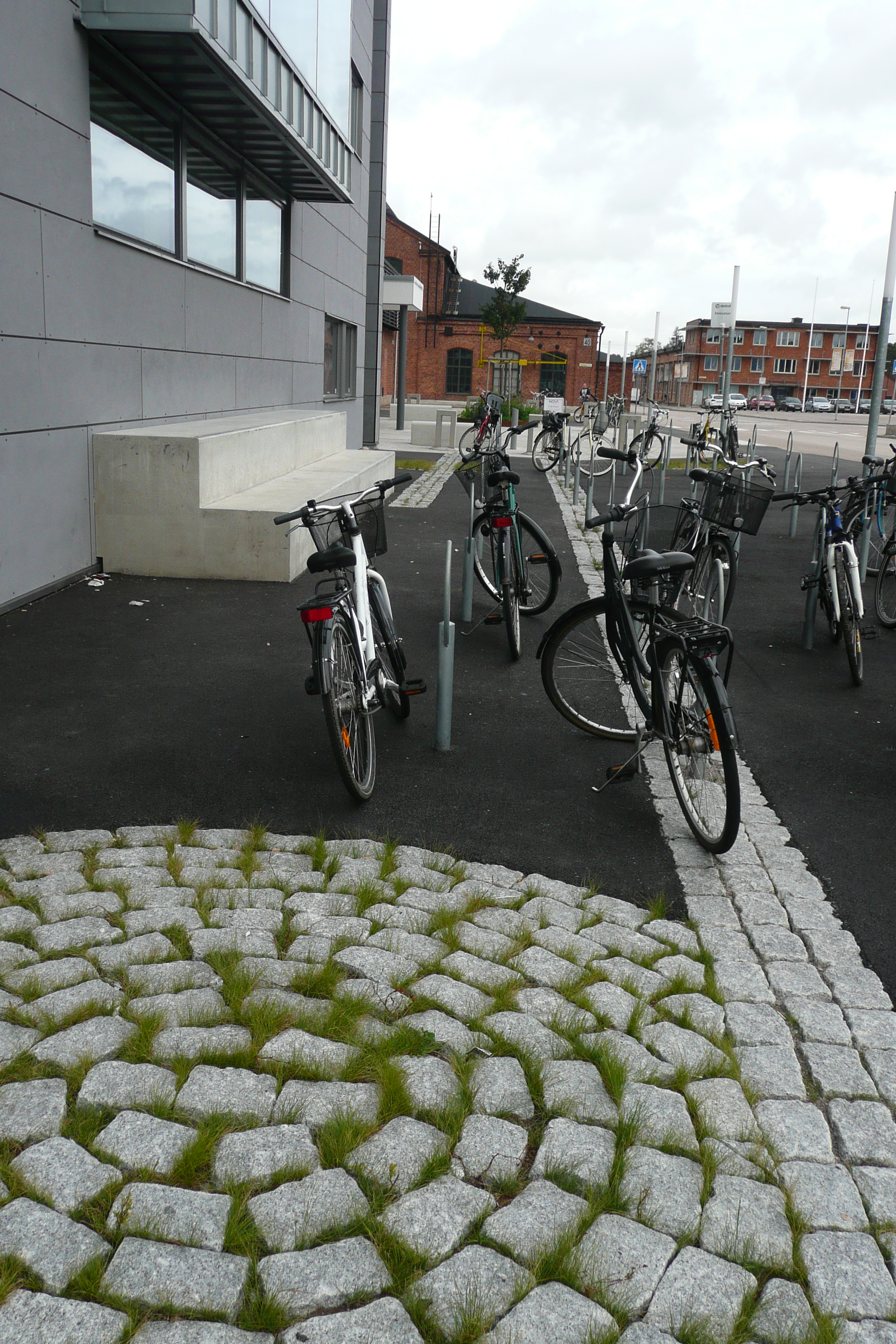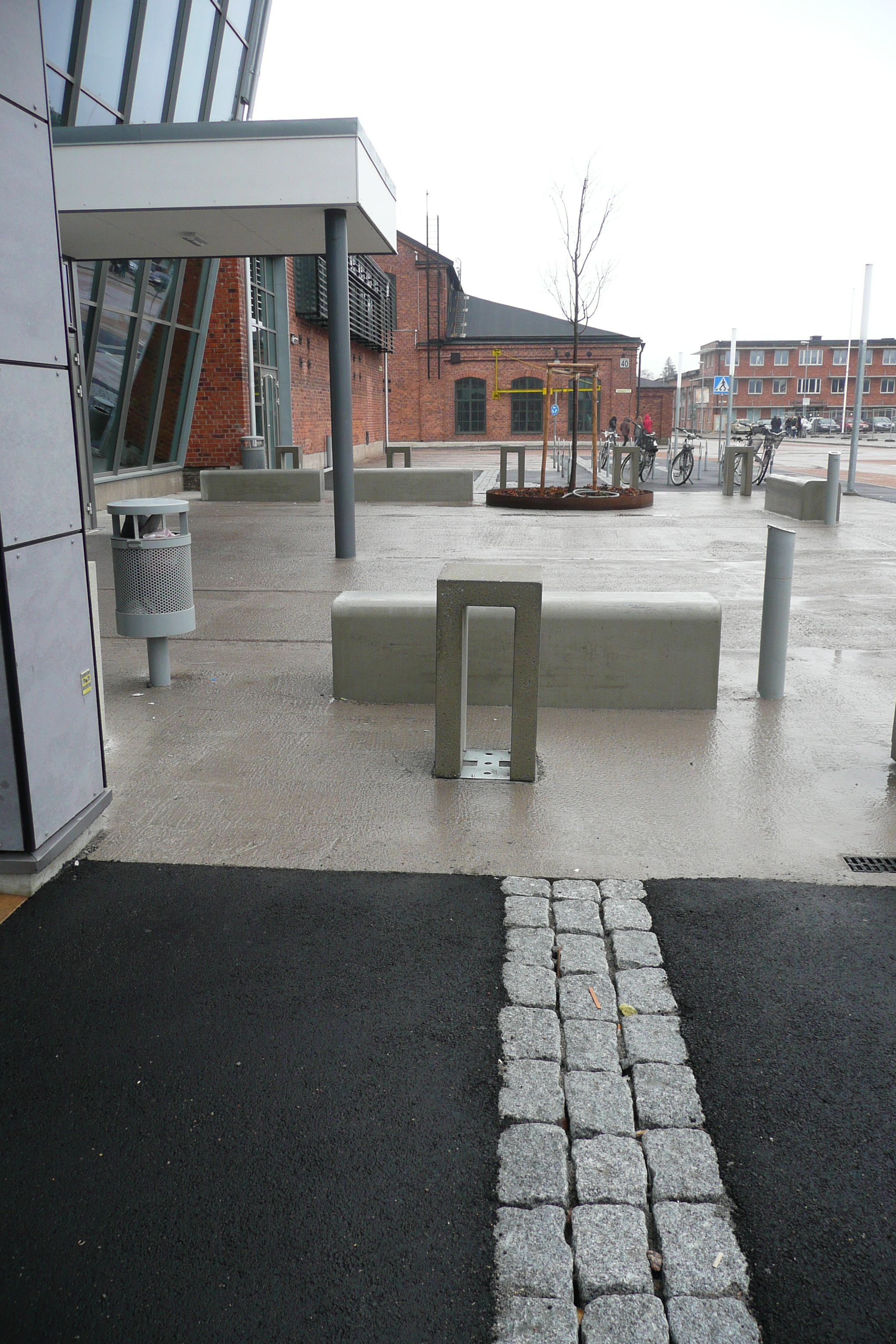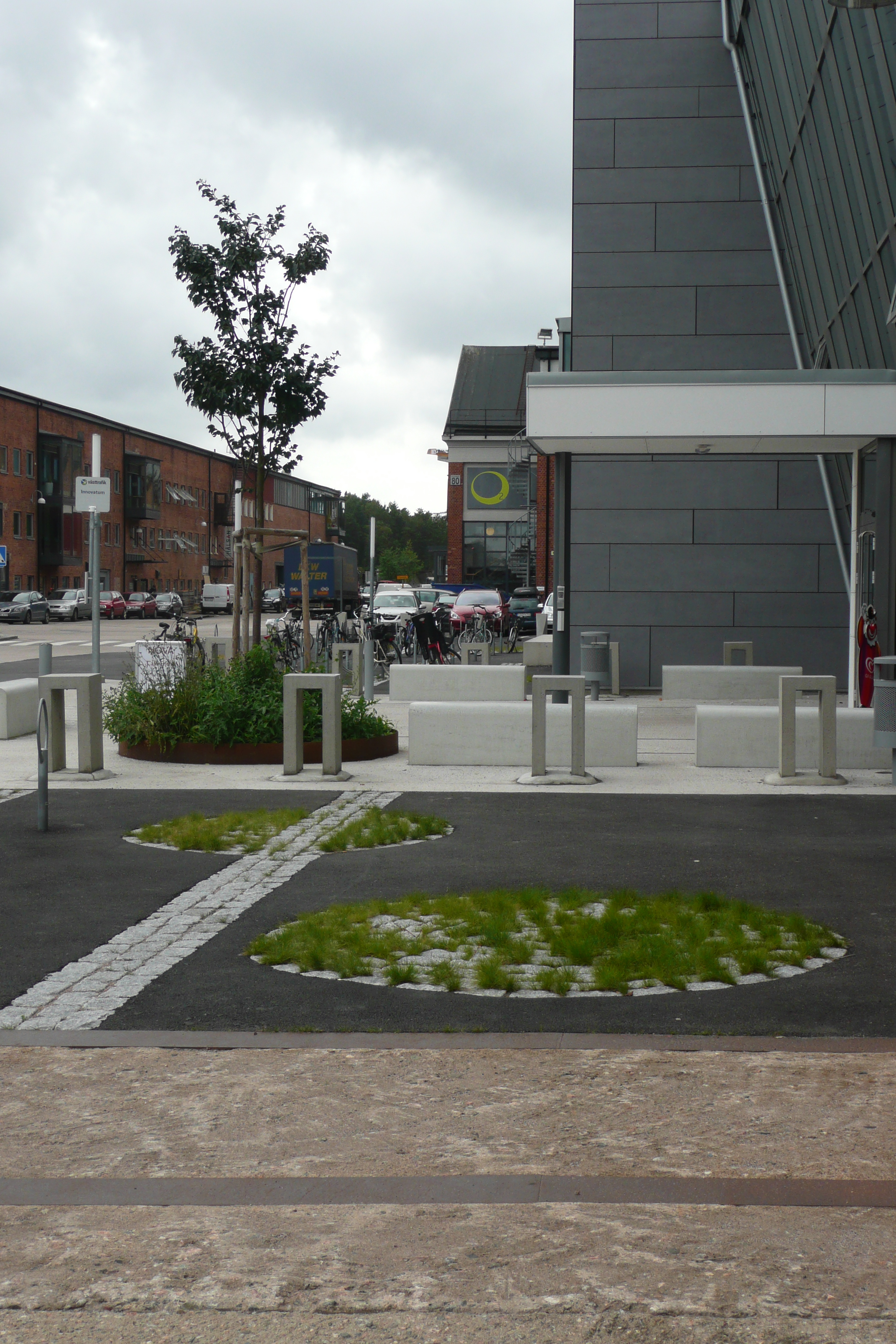 Markytor består av asfalt och betong. Det är ett före detta industriområde och detta tas upp i form av spår från historien som bryter igenom den nya anläggningen i form av tågräls och storgatsten med gräsfog.
