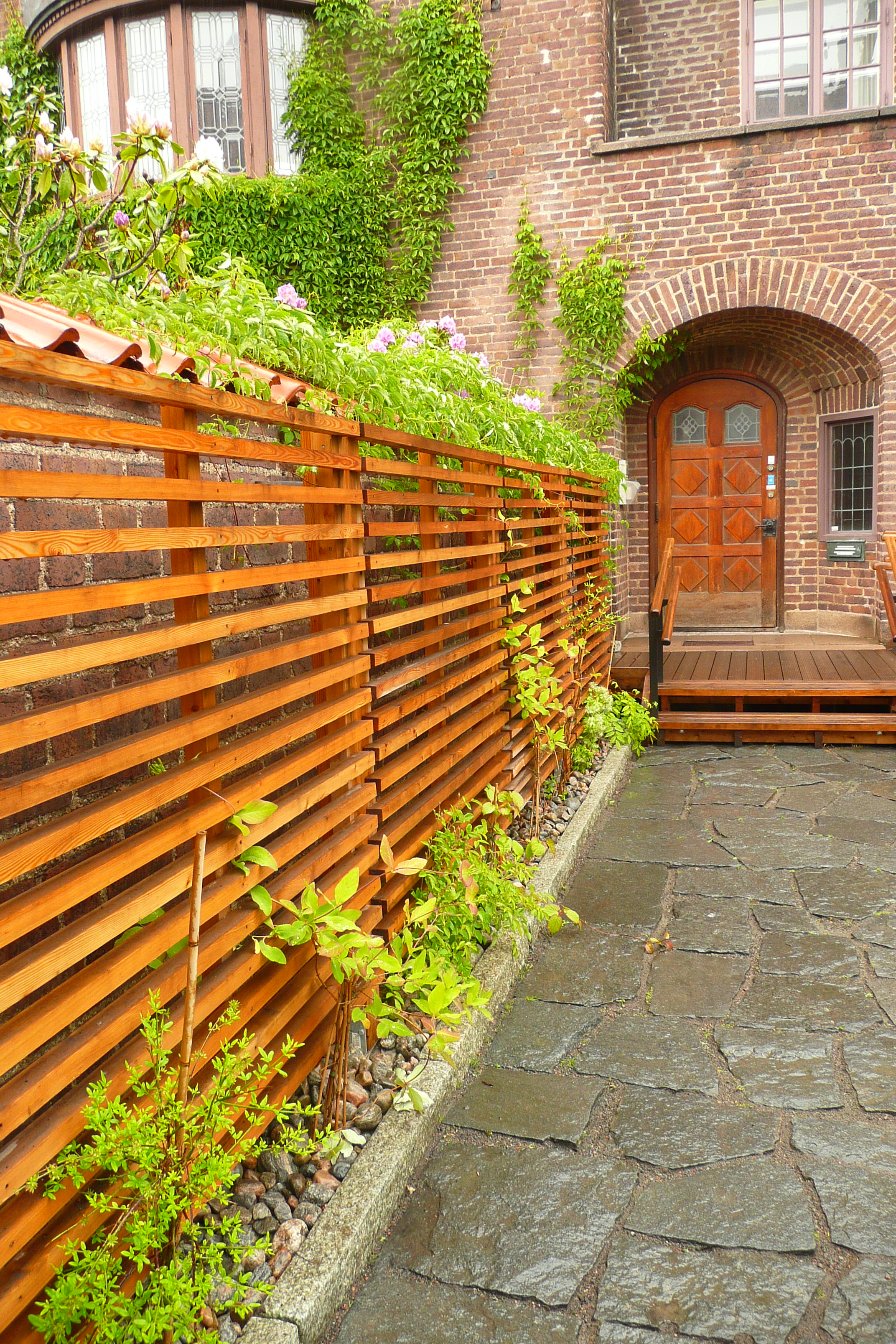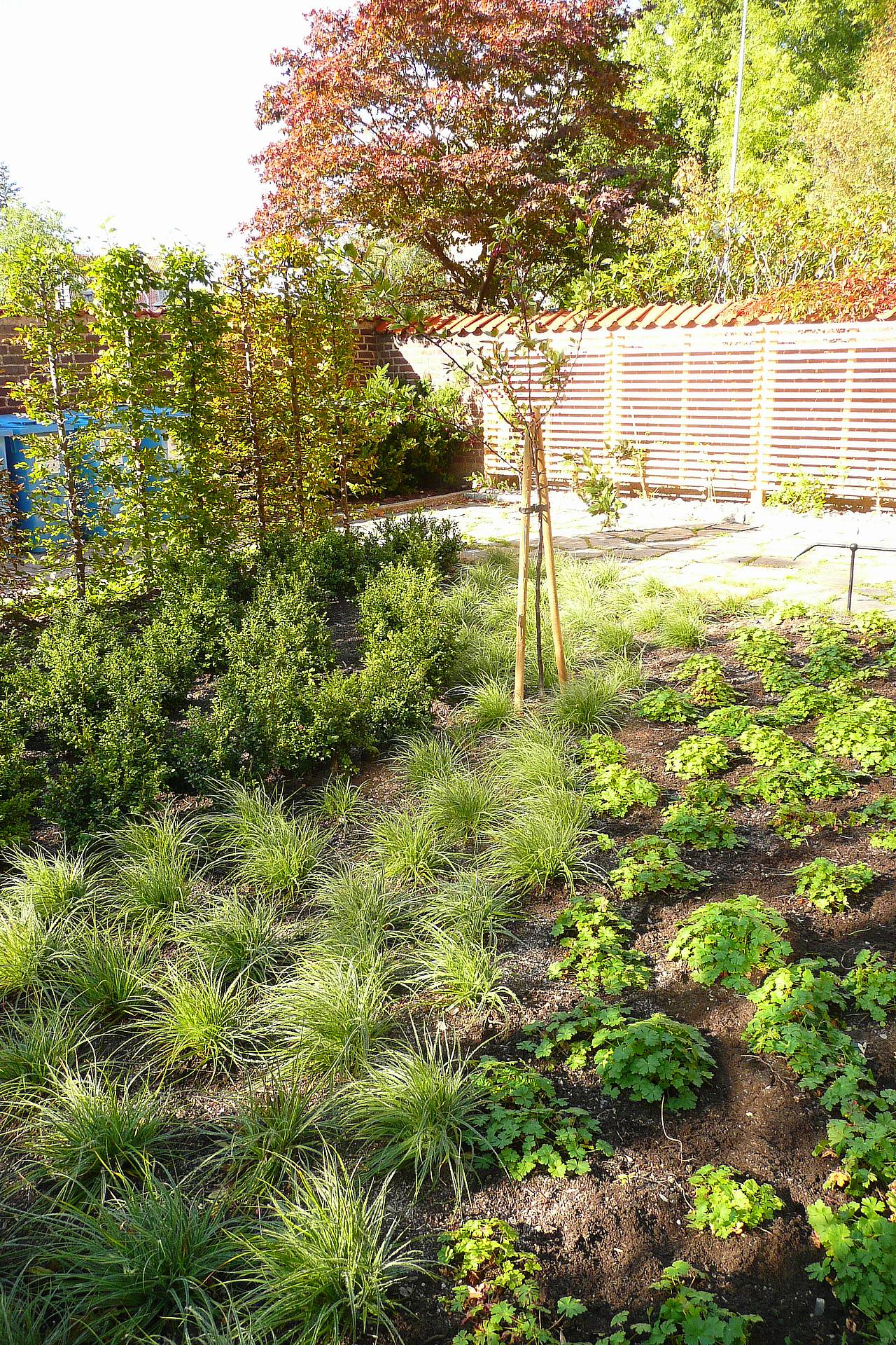 Jag vill ta bort den befintliga gräsytan och fruktträden. Mitt förslag ersätter den befintliga lösningen med olika fält av marktäckande växter och ett nytt prydnadskörsbärsträd. En yta täckt med marktäckande vegetation är vacker och lättskött. Den kommer att kräva mindre skötsel än dagens gräsmattor samt höjer gårdens kvalitet. Växtförslag inkluderar växter som är vintergröna och ger en lång blomsäsong. En formklippt avenbok häck skärmar av återvinningsområdet från resten av gården. Avenbok håller sina döda blad vintertid och ger en fortsatt avskärmande effekt.