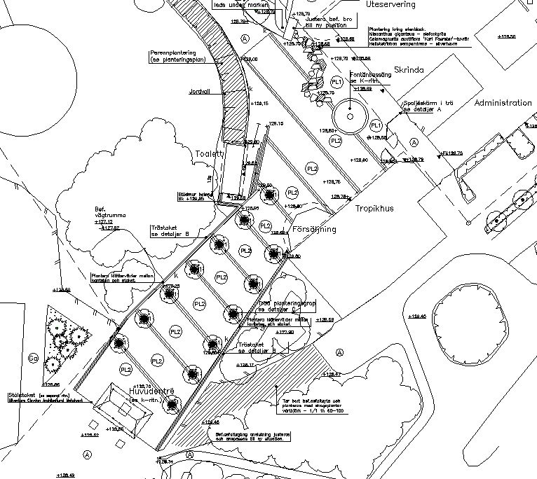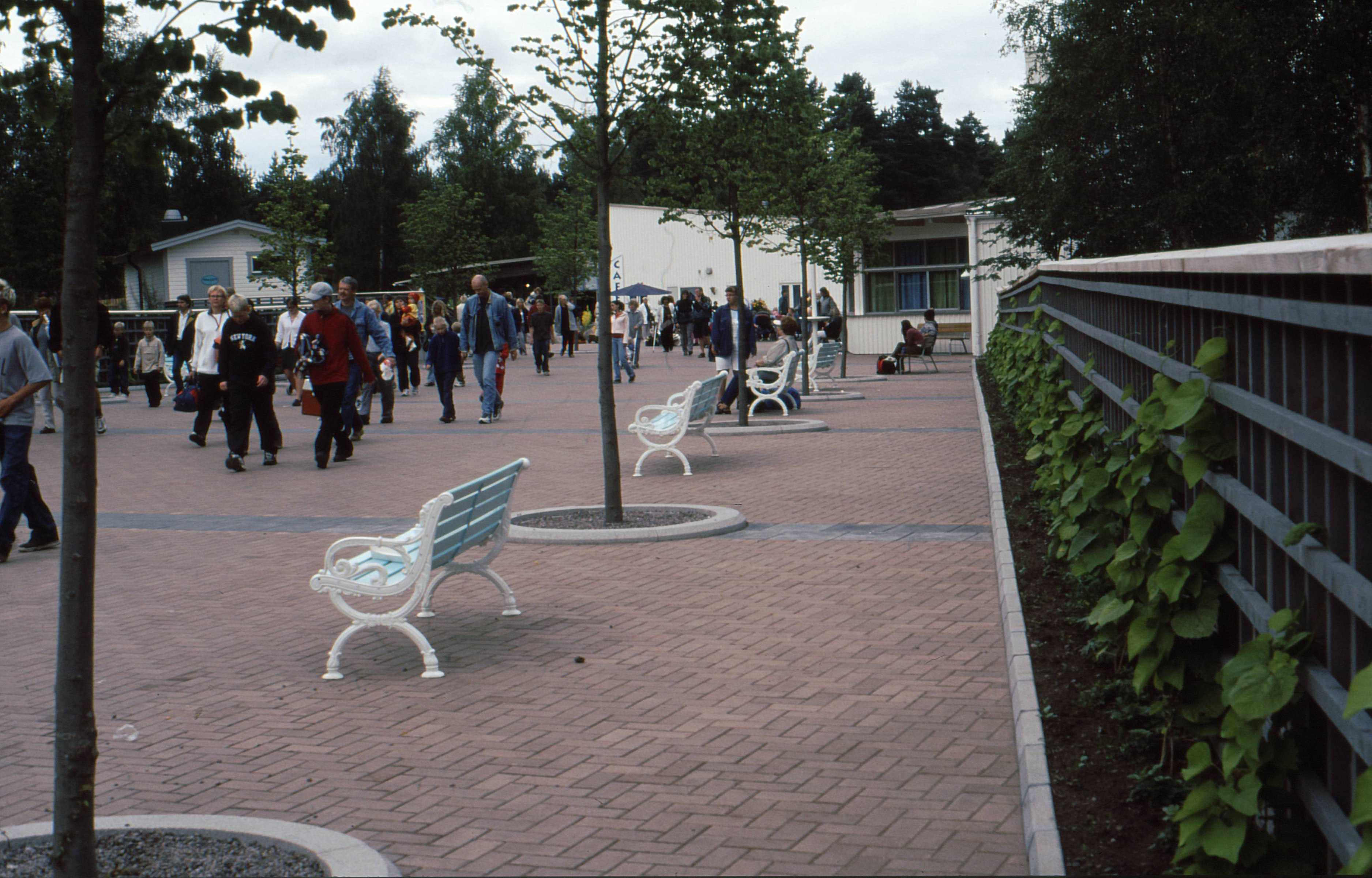 Nya entrétorget till tivoliparken. Består av speciellt designat smidesstaket vid ingången och ny alléplantering med lindträd.