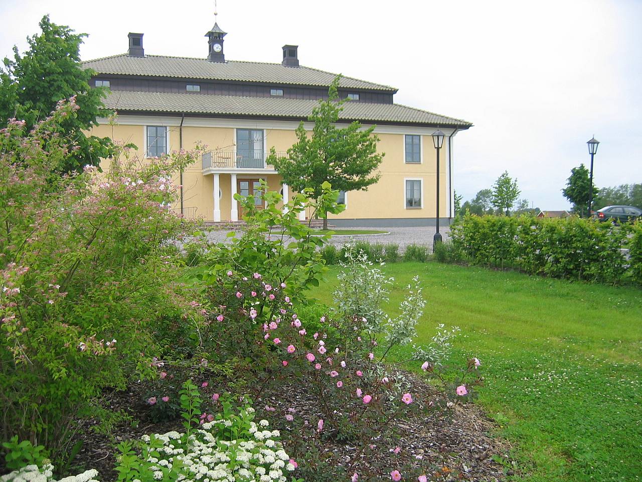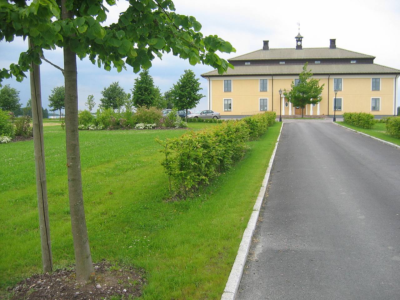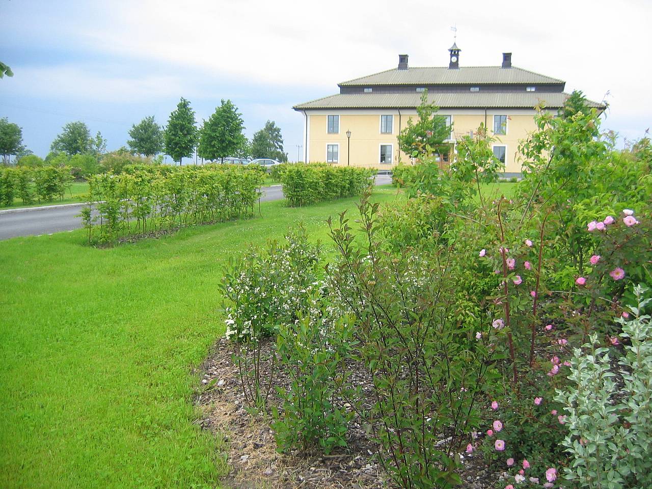 Utställningshus som står i ett slätstruket, blåsigt landskap. Huvudplanteringen är kring huvudinfarten och skapar en trevlig entré samt inramning för huset och kundparkeringen.
