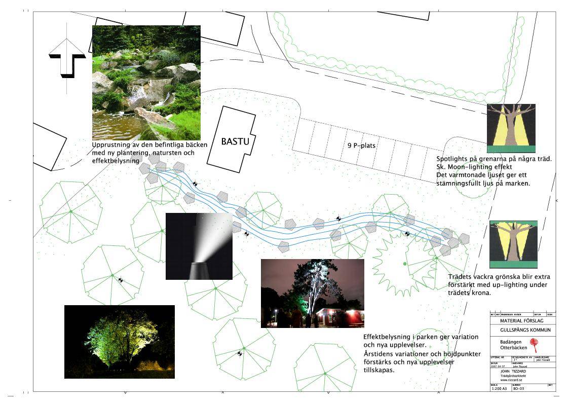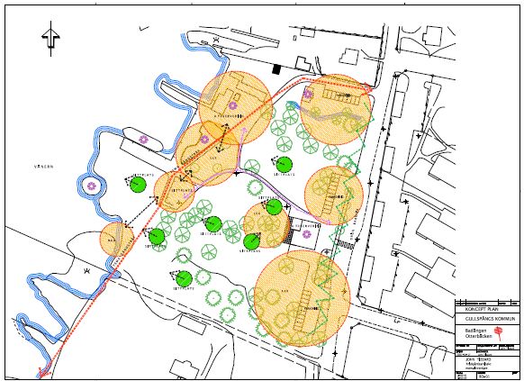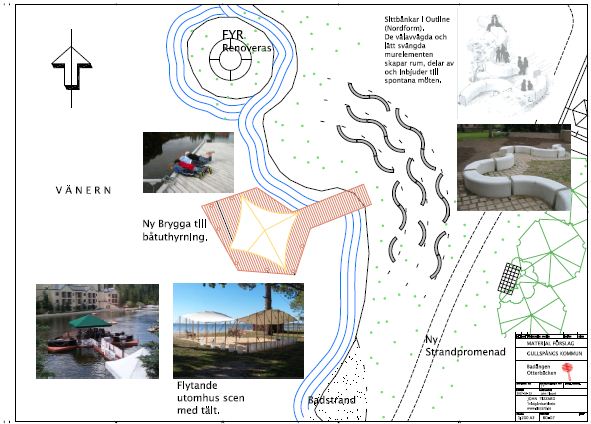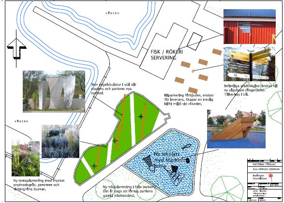 Skissförslag till ny situationsplan som inkluderar parkens framtida utformning med förslag till material, växter och belysning.