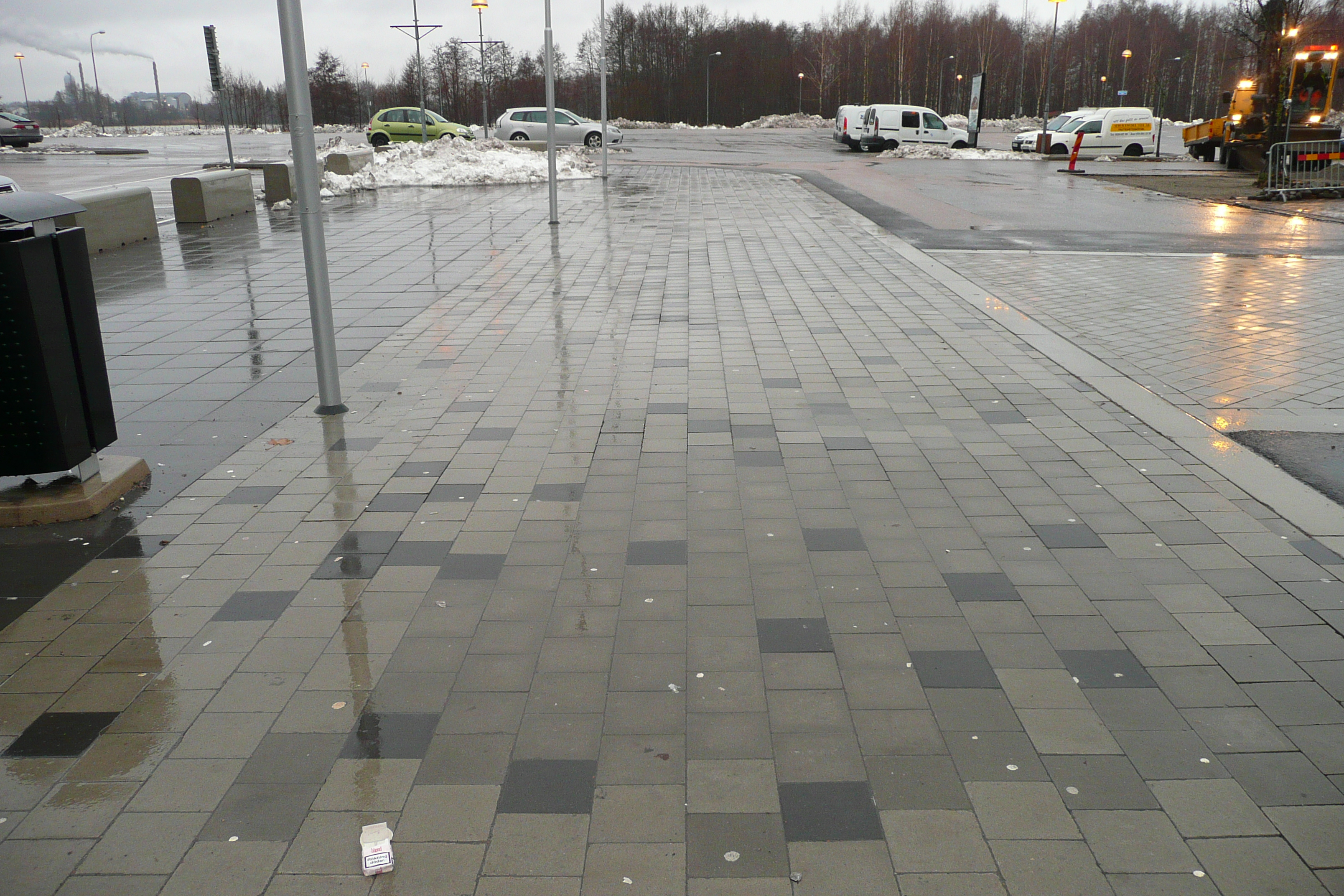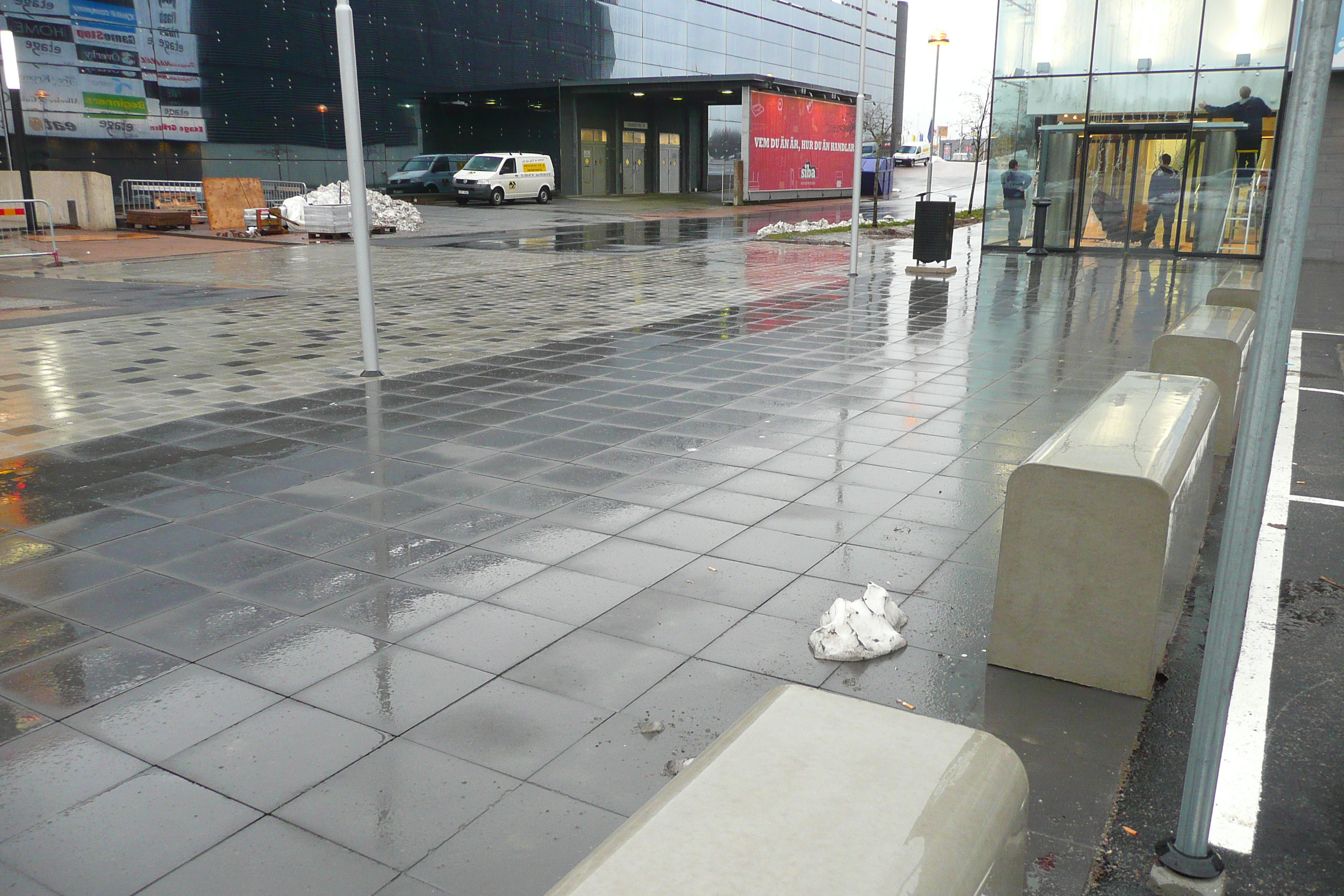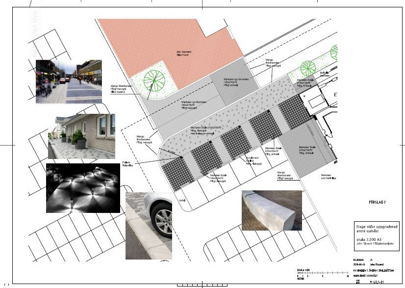 Uppgradering av hårdytor framför entré i sydväst. Med nya betong plattor, belysning och murar.